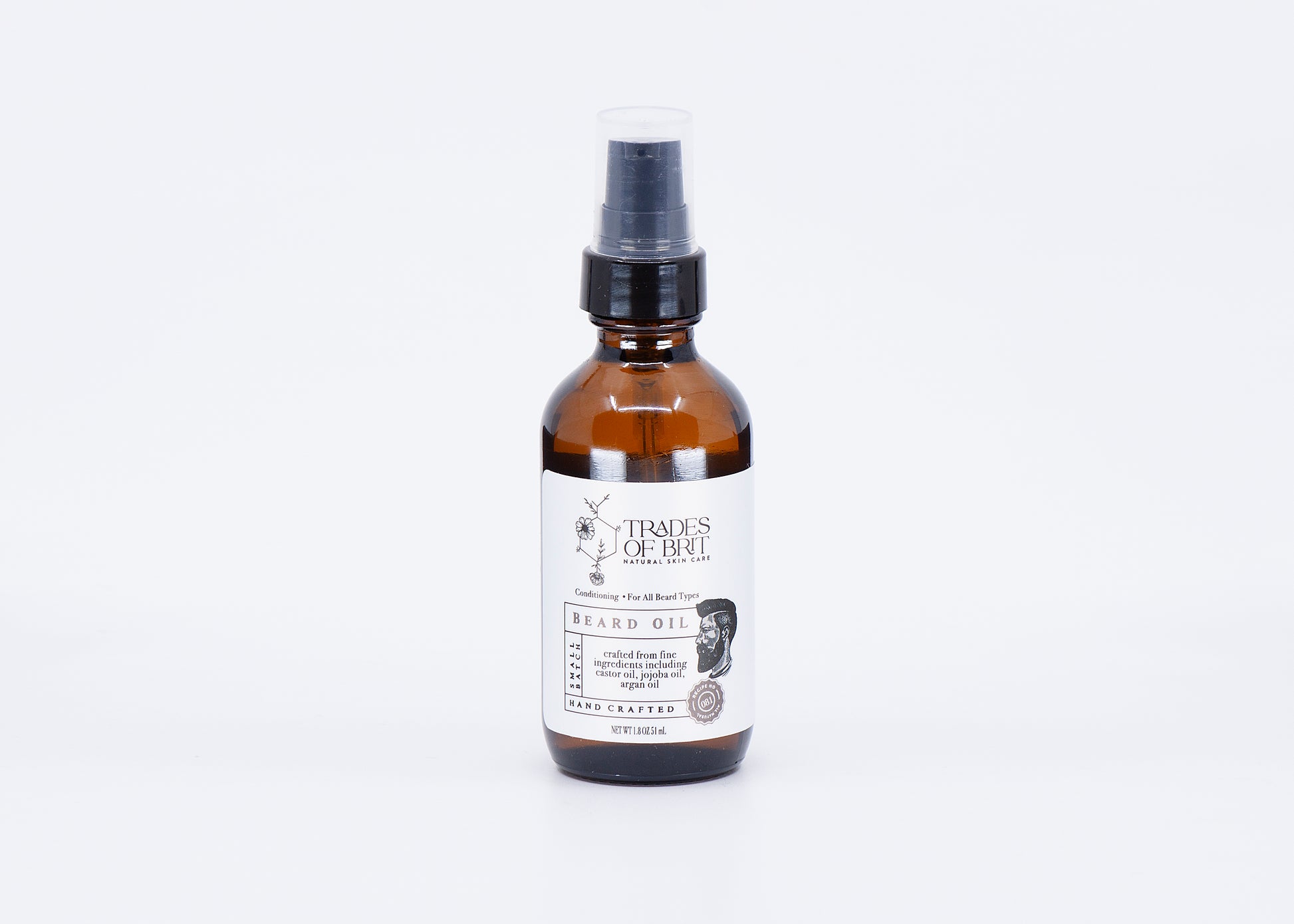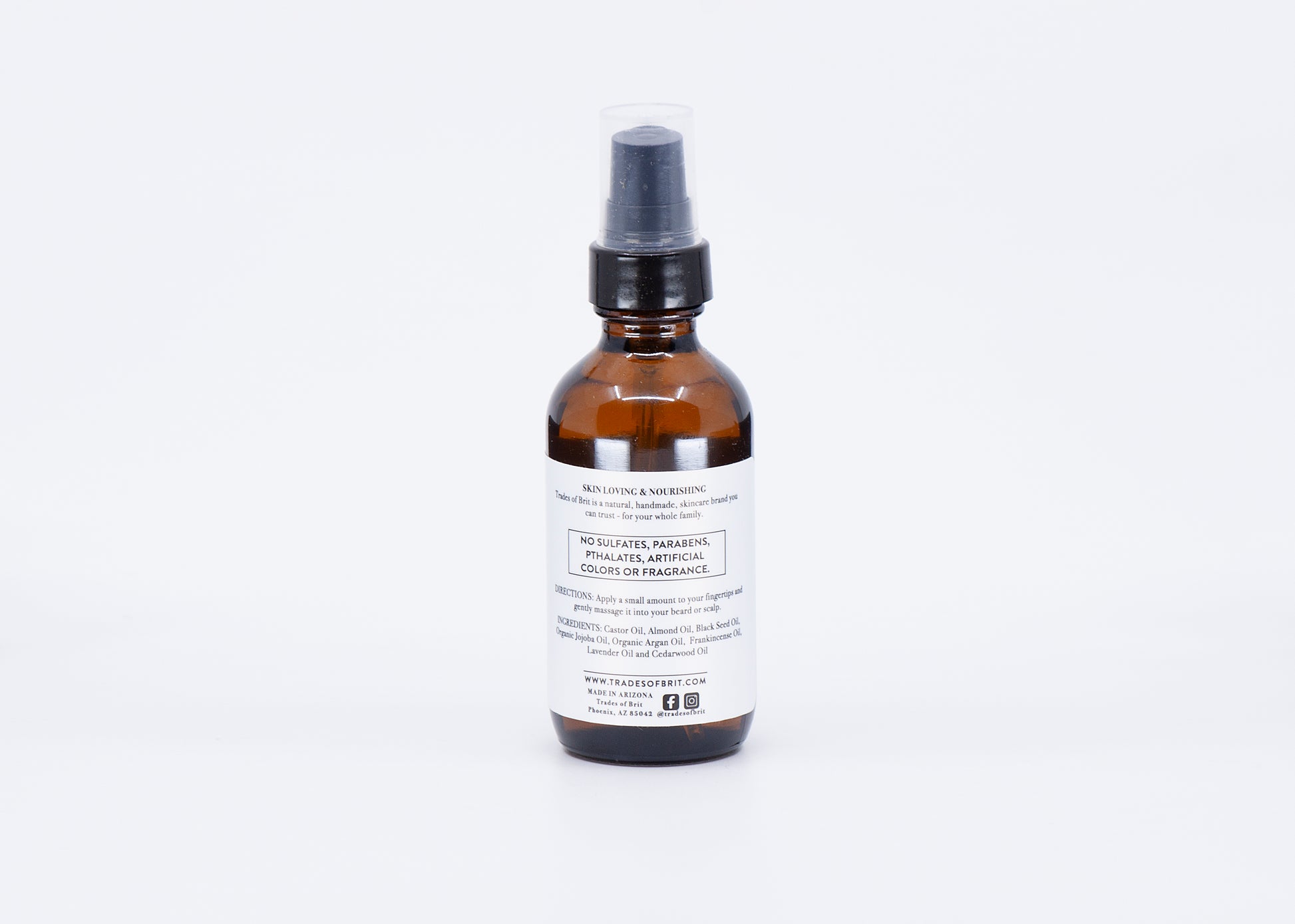 Trades of Brit's beard oil is gently crafted with a blend of castor oil, almond oil, jojoba oil, and argan oil, this formula stimulates the hair follicle, fortifies the root, and encourages the enrichment of hair growth cells.