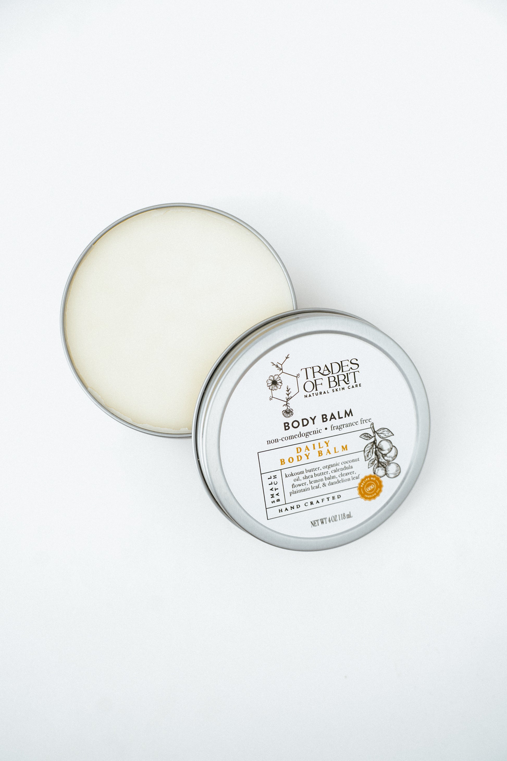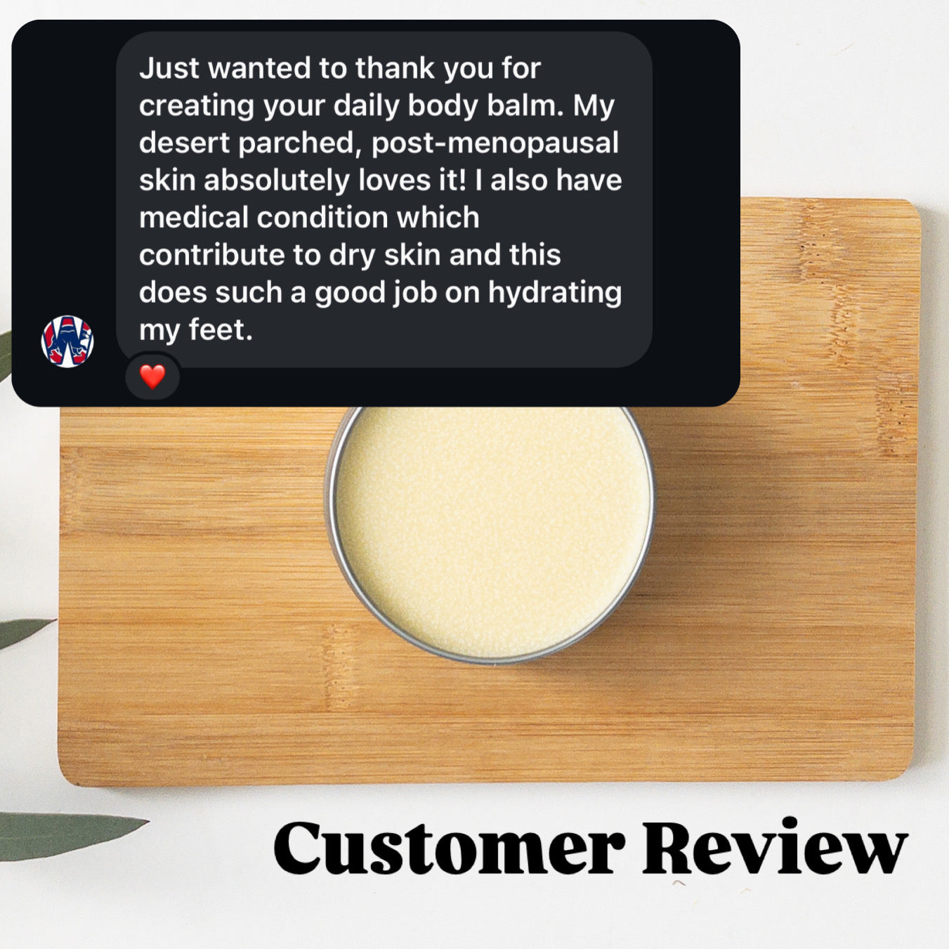 The Daily Body Balm deeply nourishes and hydrates the skin with its blend of Kokum Seed Butter, Coconut Oil, Shea Butter, and Olive Oil, while soothing and healing with Calendula, Lemon Balm, and Plantain Leaf. Rich in antioxidants and anti-inflammatory properties, it helps to repair dry, irritated skin, calm inflammation, and promote healthy skin regeneration, leaving your skin soft, smooth, and refreshed.