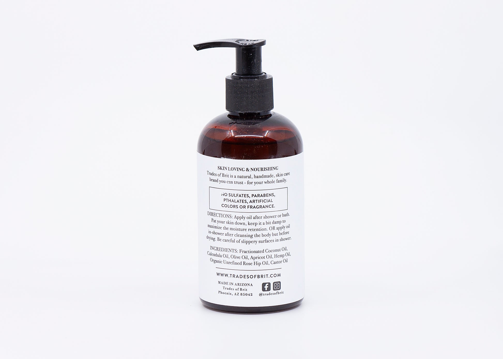 After cleansing, apply a small amount of body oil to damp skin and massage in to lock in moisture. Massage in until fully absorbed.